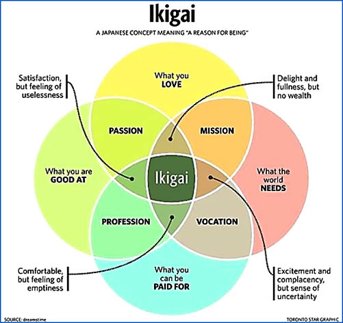 夏に出発した留学生たちの心の変化にちょっぴり敏感になっていた時、アメリカの団体で留学生をお世話してくれている担当責任者から朝4時にメールが届きました。「またトラブル!?今度は誰?」とドキドキしながらメールのタイトルを確認すると“Re. Ikigai”と書かれていました。「Ikigaiについて?誰それ、そんな名前の子、派遣していないし…他の国の子?」と半分寝ぼけて内容を確認すると “I know you are very busy, but when you have a minute, can you tell me more about what Ikigai means?” (あなたがすごく忙しいのはわかっているけれど、もし1分でも時間があったら、「生きがい」の意味を教えて)と4つの丸が重なり合って、重なり合う部分にIkigaiと書かれたベン図が添付されていました。
